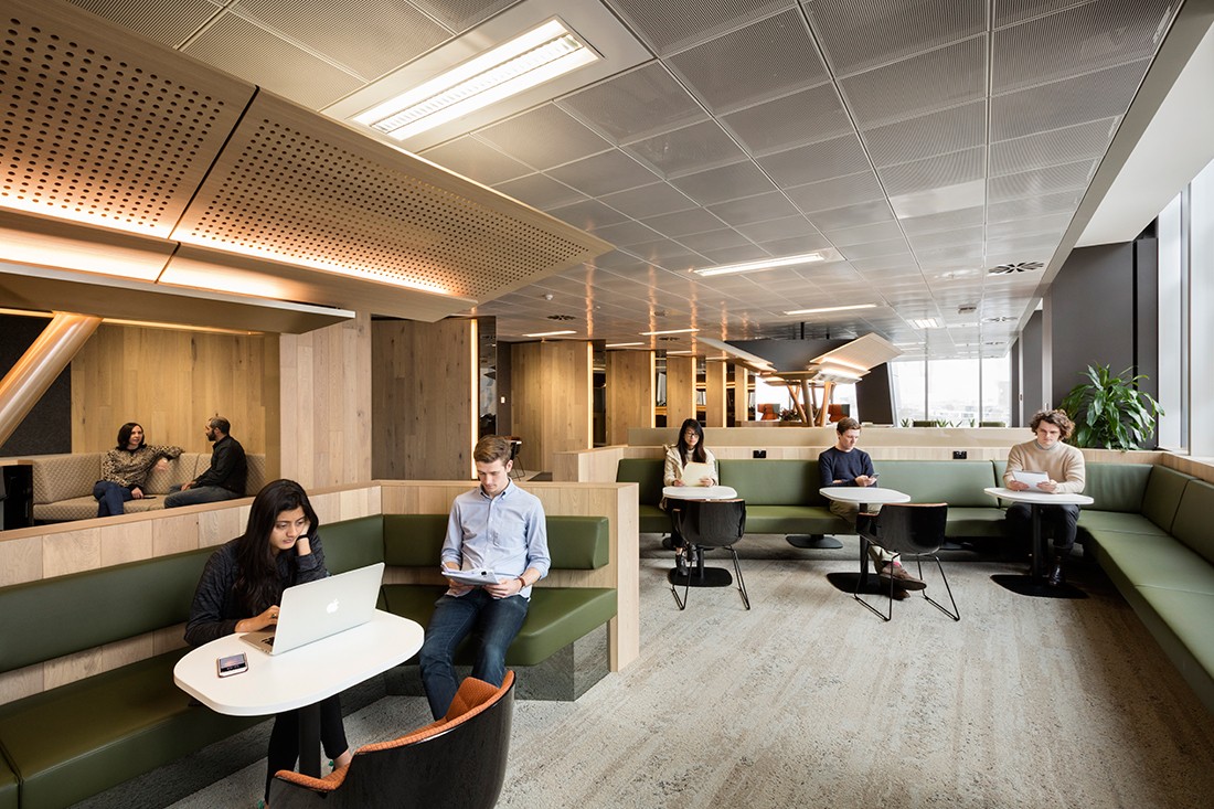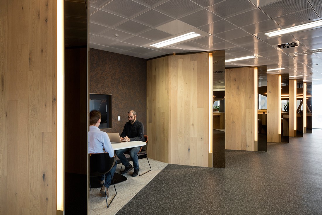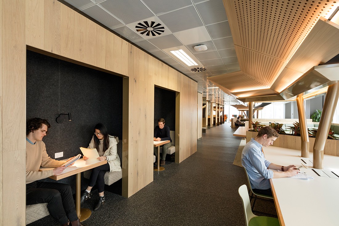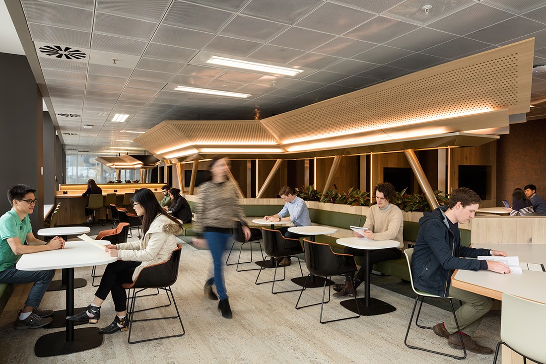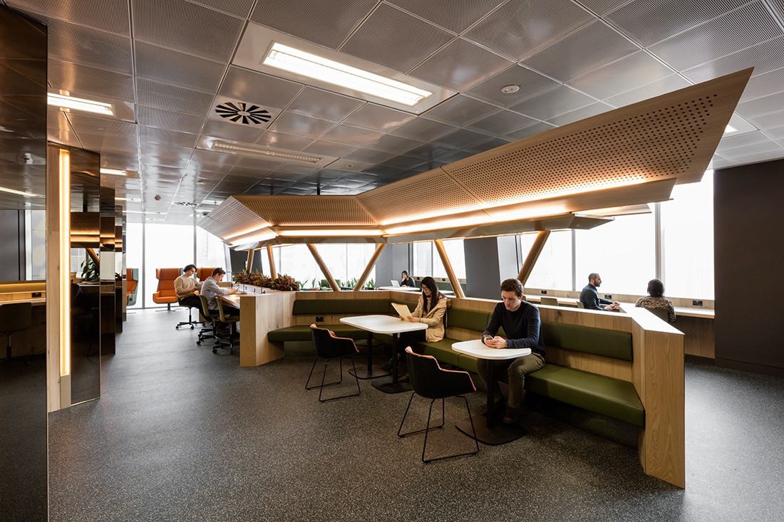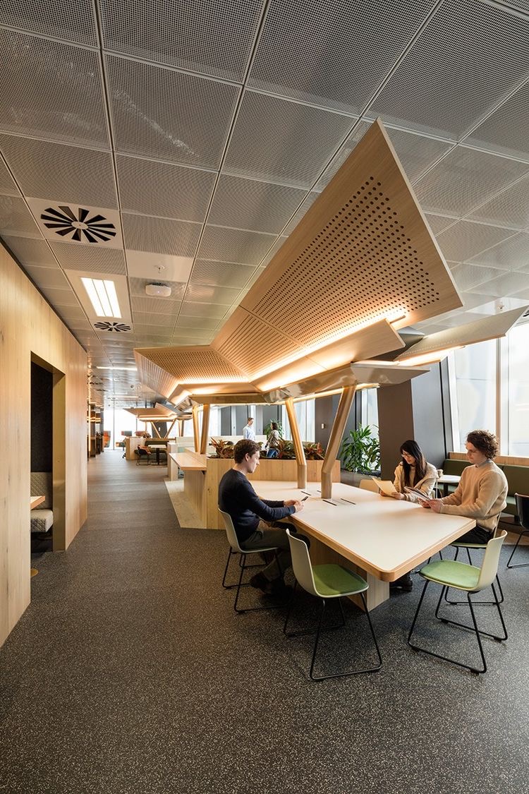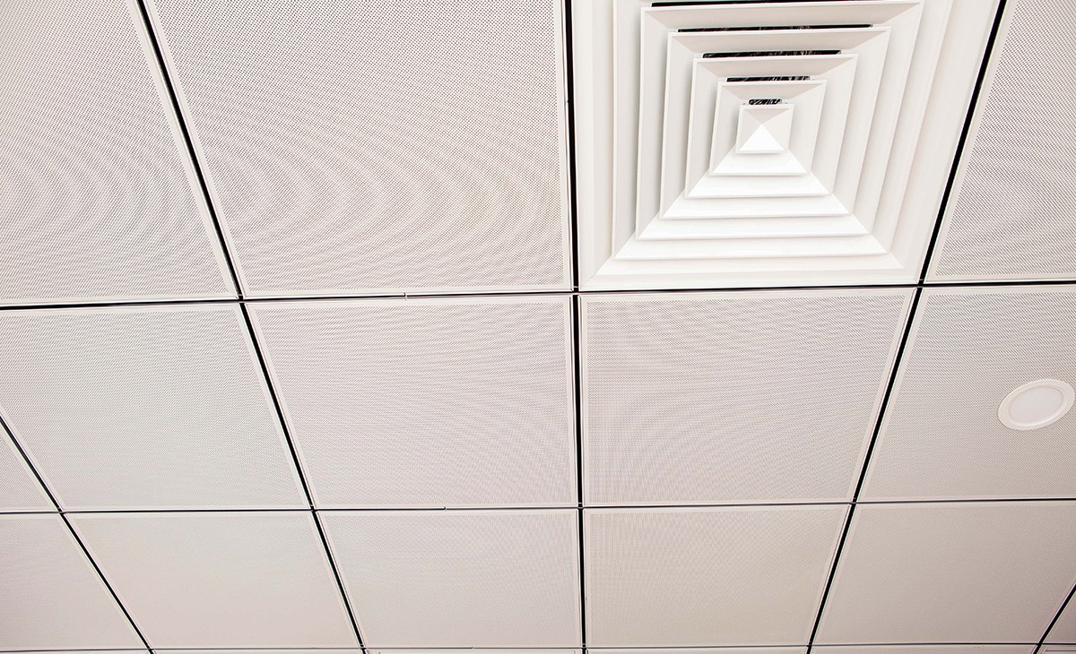 Sử dụng hệ thống treo lộ khung, trần vuông BASI Lay-in T-Black cho cảm quan về mảng trần hình khối gọn gàng.